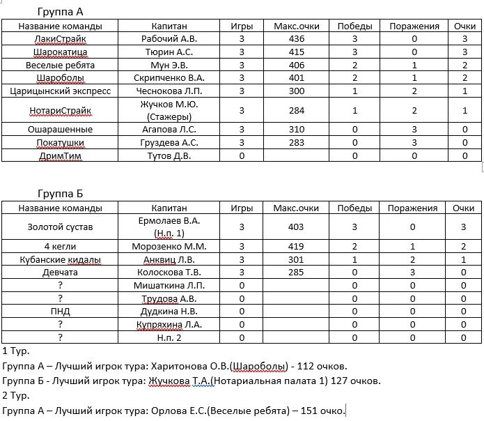 По результатам промежуточных игр лидируют команды: в группе А — «ЛакиСтрайк» (капитан Рабочий А.В.), в группе Б — «Золотой сустав» (капитан Ермолаев В.А.).