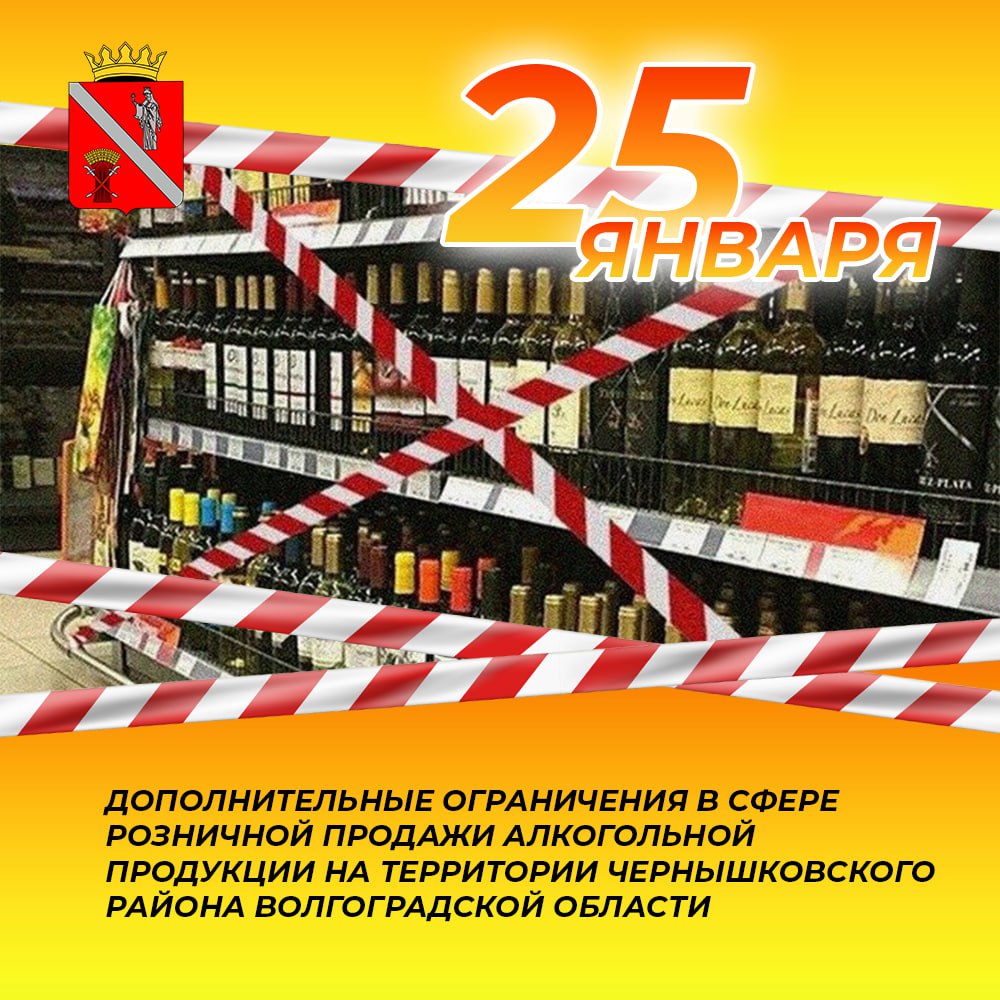 В соответствии с подпунктом 1 пункта 1 статьи 3 Законом Волгоградской области от 15.03.2019 № 17-ОД «О регулировании отдельных отношений в сфере розничной продажи алкогольной продукции на территории Волгоградской области, за исключением розничной продажи алкогольной продукции при оказании услуг общественного питания», 25 января 2024 года на территории Волгоградской области установлен запрет розничной продажи алкогольной продукции с 8-00 до 23-00 часов.