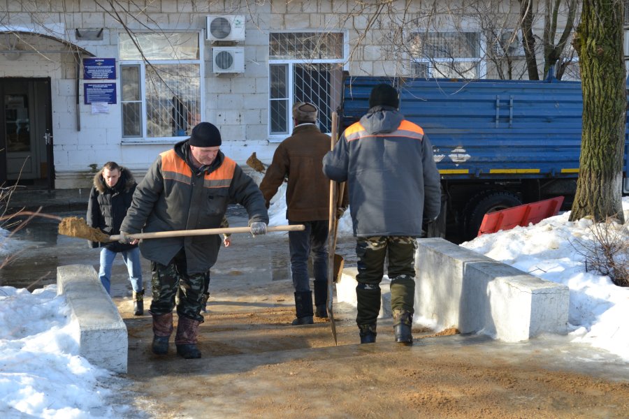 Дорожные рабочие МКУ «Благоустройство г. Жирновск», вооружённые совковыми лопатами усиленно сыпят пескосоляную смесь на тротуары и пешеходные переходы.
