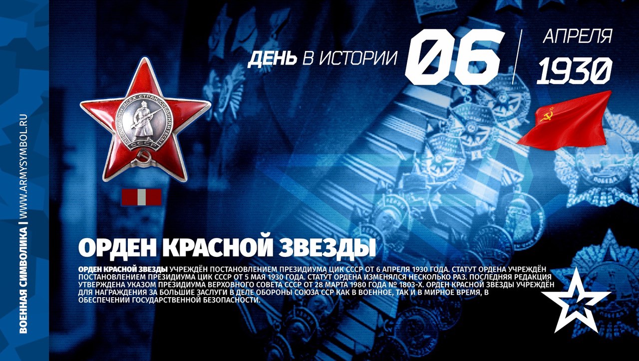 Один из первых советских орденов и второй из боевых по времени учреждения – Орден Красной Звезды был учрежден Постановлением Президиума ЦИК СССР от 6 апреля 1930 года, а еще через месяц – и его статут.