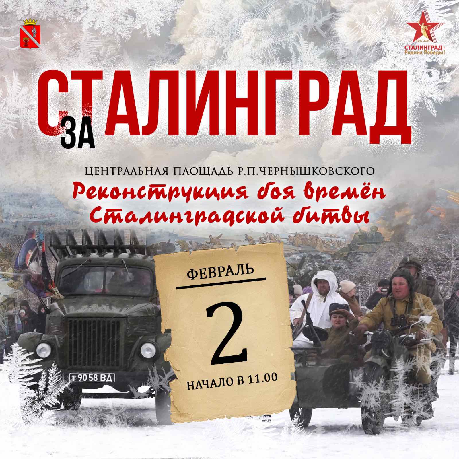 В пятницу, 2 февраля, на центральной площади р.п. Чернышковского можно посмотреть реконструкцию боя времен Сталинградской битвы «За Сталинград».