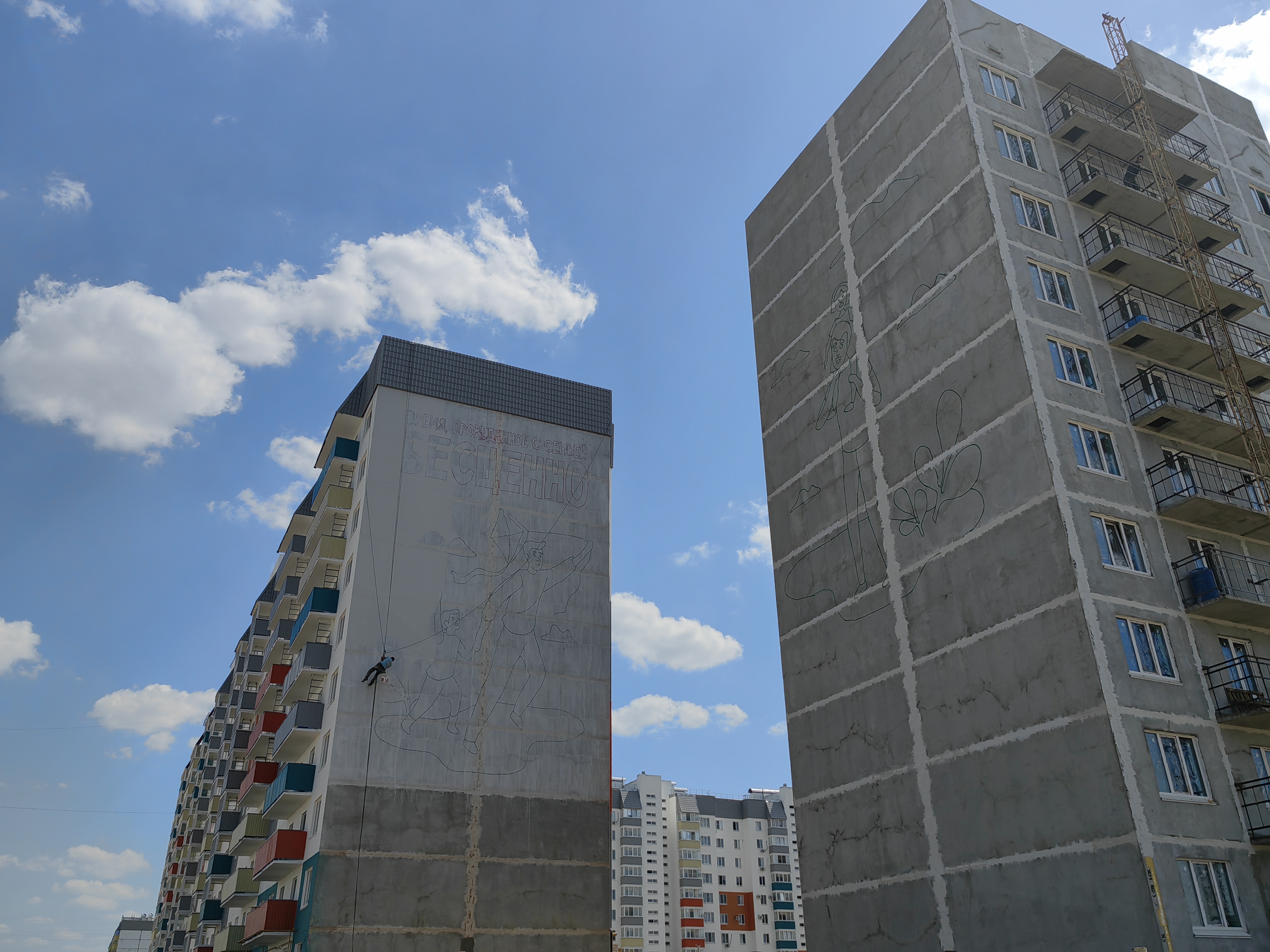В Волжском начались работы по созданию нового мурала на фасаде дома № 347 по проспекту Ленина. Монументальный рисунок будет состоять из двух частей и станет подарком к 70-летию города от строительной компании «Флагман».