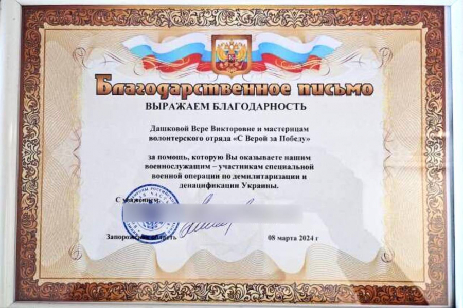 На днях за самоотверженный труд антиповским мастерицам из волонтёрского отряда «С Верой за Победу» было вручено Благодарственное письмо от военных.