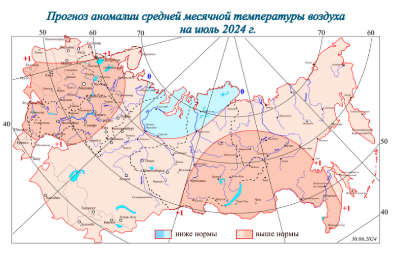 В целом, судя по прогнозу аномалии средней месячной температуры воздуха на июль 2024 года от гидрометцентра, температура в Волгоградской области превышает норму на 1 градус.