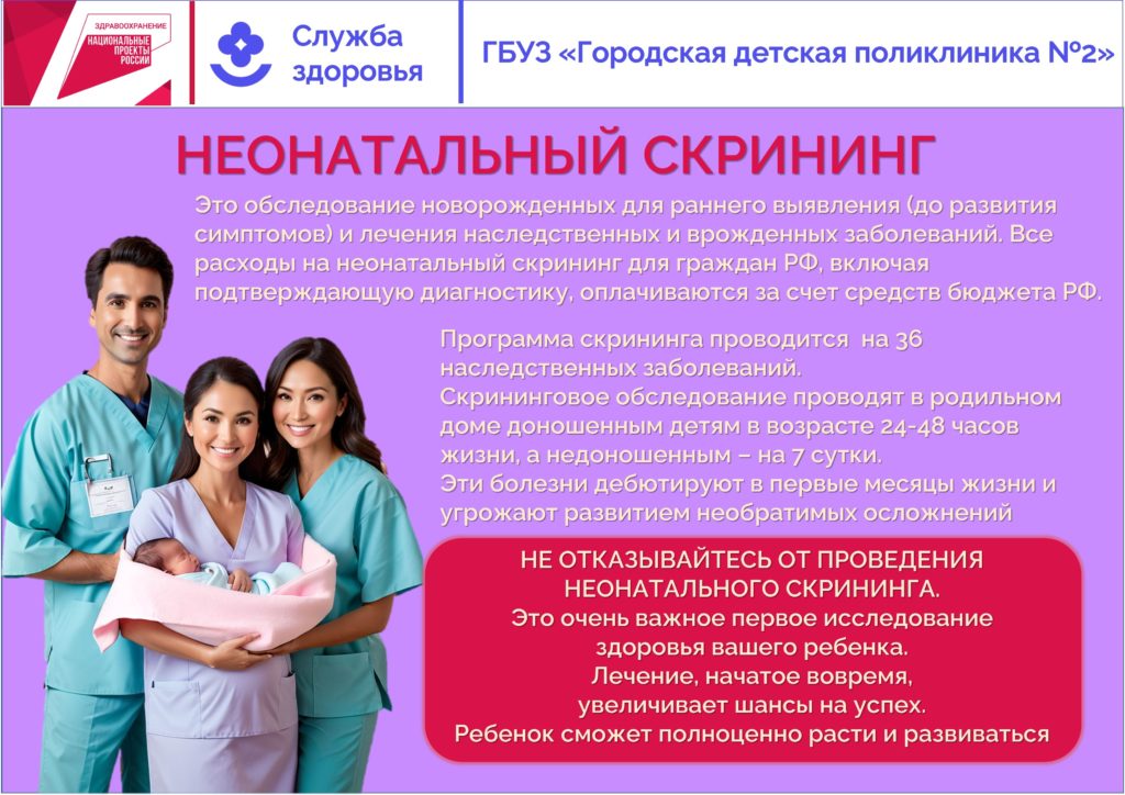 Наследственные болезни обмена веществ (НБО) — группа генетических заболеваний, при которых происходят нарушения в биохимических процессах и поражаются различные системы и органы. При большинстве НБО для лечения применяют диетотерапию, которую необходимо начать как можно раньше, чтобы сохранить здоровье ребенка. Врождённый гипотиреоз — наследственная патология щитовидной железы, которая может привести к отставанию в физическом развитии и тяжёлой умственной неполноценности. На сегодняшний день своевременно диагностированный гипотиреоз хорошо поддается гормональной терапии. Адреногенитальный синдром — группа нарушений, связанных с избыточной секрецией гормонов коры надпочечников. Заболевание имеет различные формы, в особо тяжёлых случаях проявляется нарушением водно-солевого обмена и полиорганной недостаточностью. Полному излечению этот синдром не поддаётся, но его можно держать под контролем при помощи гормональной терапии. Муковисцидоз — одно из наиболее распространённых наследственных заболеваний. Проявляется поражением легких, печени, желудочно-кишечного тракта и других систем организма. Необходимо начинать лечение как можно раньше, чтобы максимально улучшить качество и продолжительность жизни. Спинальная мышечная атрофия — это тяжёлое наследственное нервно-мышечное заболевание. Болезнь может начаться с первых месяцев жизни, проявляться постепенно нарастающей слабостью мышц и приводить к тяжёлым двигательным нарушениям. В настоящее время существует терапия, которая вместе со специализированной реабилитацией может в значительной степени уменьшить проявления этого заболевания. Первичные иммунодефициты (ПИД) — это наследственные заболевания иммунной системы. Дети с ПИД подвержены высокому риску развития тяжёлых инфекций с первых дней жизни. Если заболевание выявлено вовремя, повышается успешность лечения, позволяющего восстановить нормальную функцию иммунной системы.Обследование новорожденного проводится только при наличии письменного согласия родителя или законного представителя ребенка. От неонатального скрининга можно отказаться, однако стоит иметь в виду, что при отказе от обследования ребенка диагноз наследственного и (или) врожденного заболевания будет поставлен несвоевременно и лечение будет начато поздно, что приведет к негативным последствиям для его здоровья.