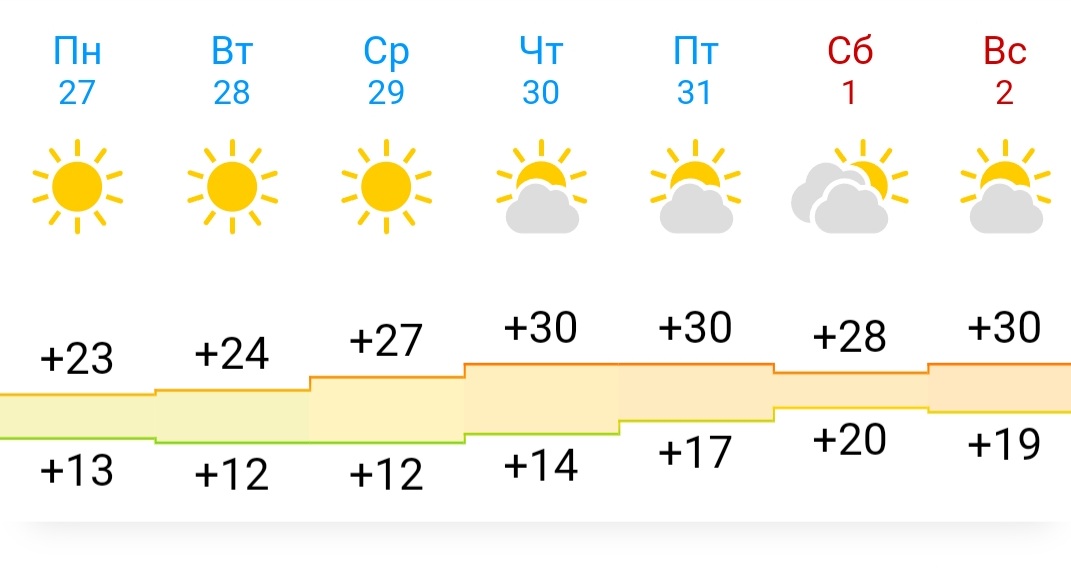 Так, согласно метеопрогнозу сервиса Гисметео, в первые дни следующей рабочей недели воздух днём прогреется до +23…+25 градусов тепла, среда будет ещё теплее, а примерно с четверга, 30 мая, Камышинский район накроет настоящая летняя жара до +30 градусов.