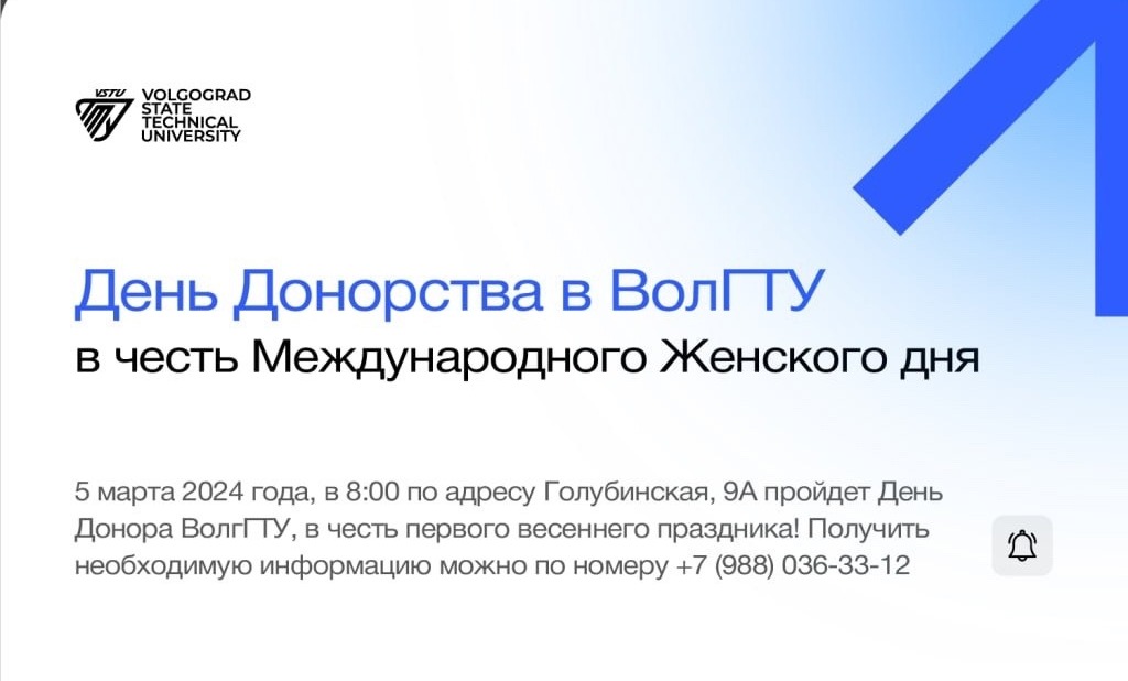 Проект корпоративного донорства ВолгГТУ «Живая кровь», обращает внимание политехников на то, что 5 марта вновь пройдет День донора ВолгГТУ.