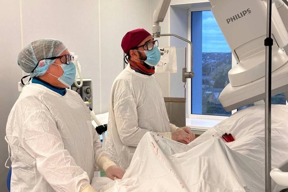 Уникальную сосудистую операцию проводили на ноге пациента путем прокола на его руке. У мужчины была диагностирована закупорка аорты ниже почечных артерий. Он жаловался на постоянную боль в ноге.